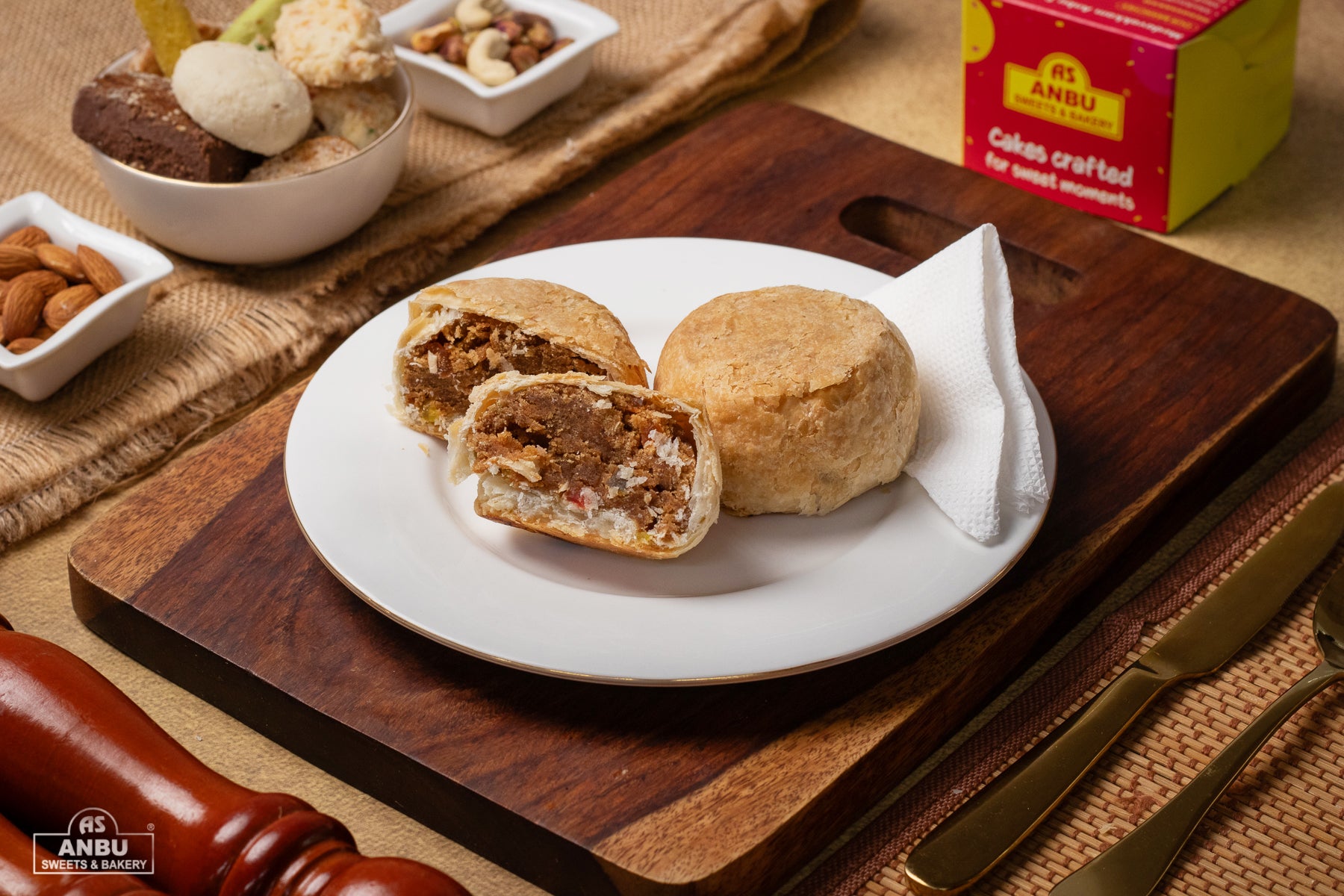 Flaky sweet puff with a light, sugary filling wrapped in crispy pastry, baked fresh at Anbu Bakery. A simple and comforting snack loved in Chennai for its mild sweetness and crunch.